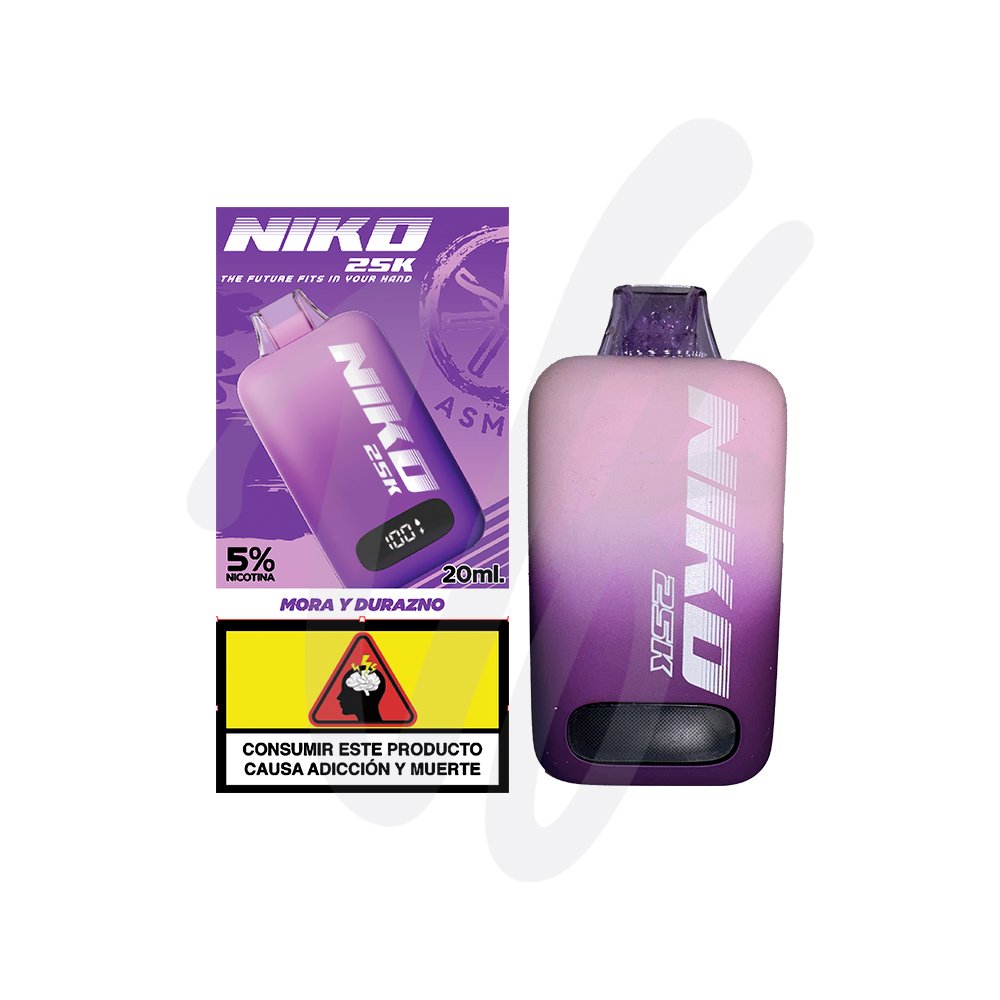 NIKO 25.000 Puff Desechable es un dispositivo de vapeo desechable de alta capacidad que ofrece hasta 20,000 caladas, destacando por sus dos resistencias (Dual Mesh) que brindan una potencia constante, 20 ml de e-líquido con 5% de nicotina y batería recargable de 850 mAh con pantalla LED. Cuenta con flujo de aire ajustable y carga rápida USB Tipo-C.